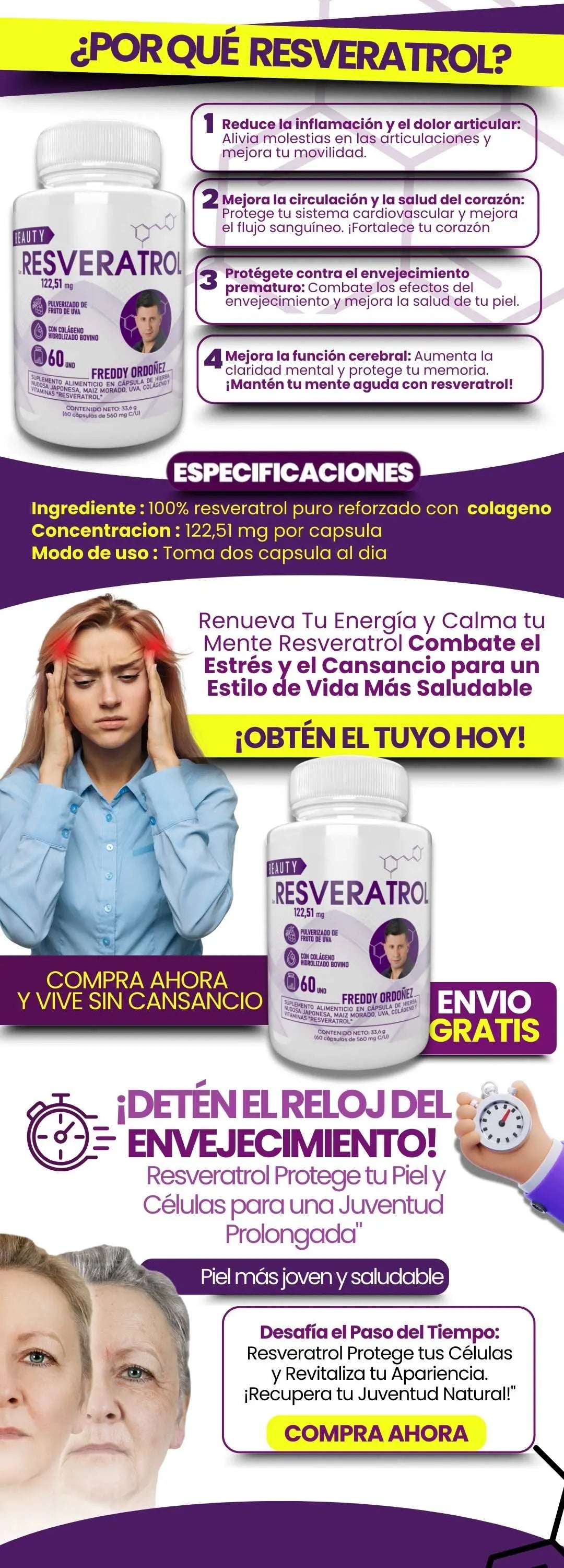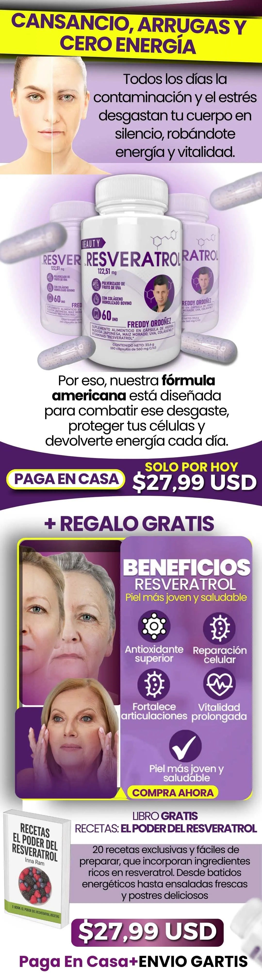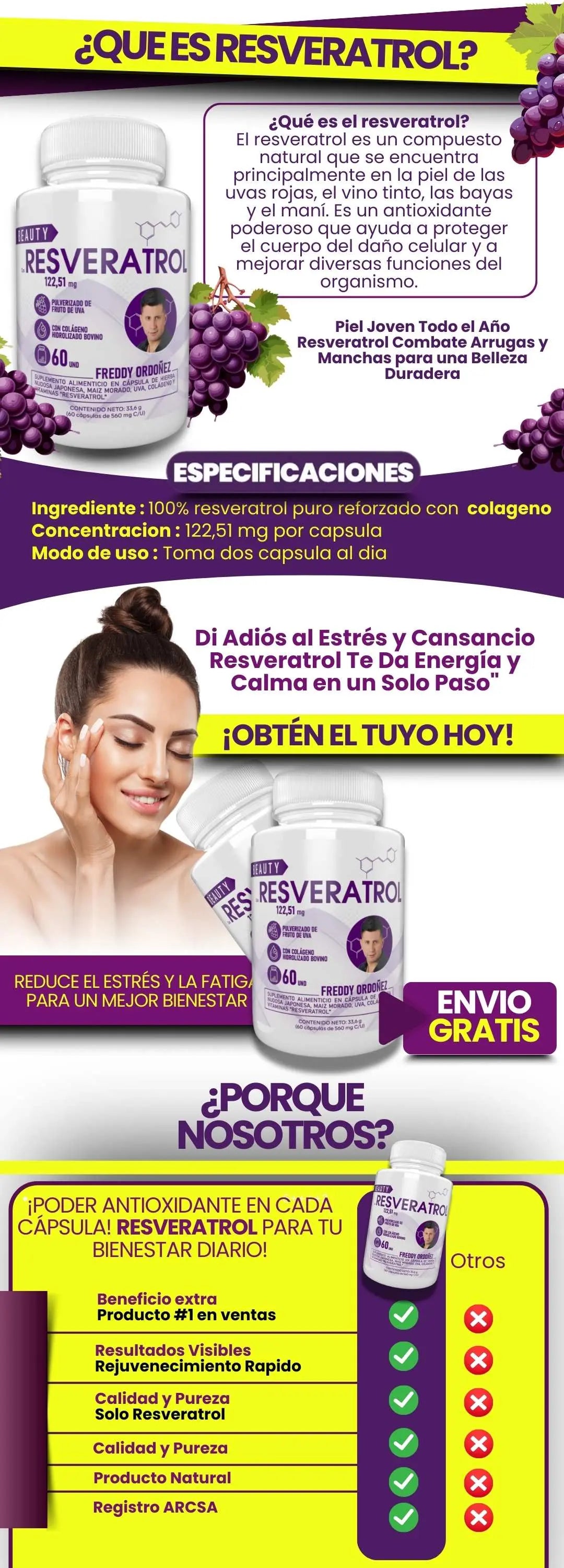 Es un suplemento con resveratrol (antioxidante) orientado al cuidado de la piel y al bienestar diario. Apoya una apariencia más descansada y vital. No es un medicamento ni reemplaza una alimentación equilibrada.